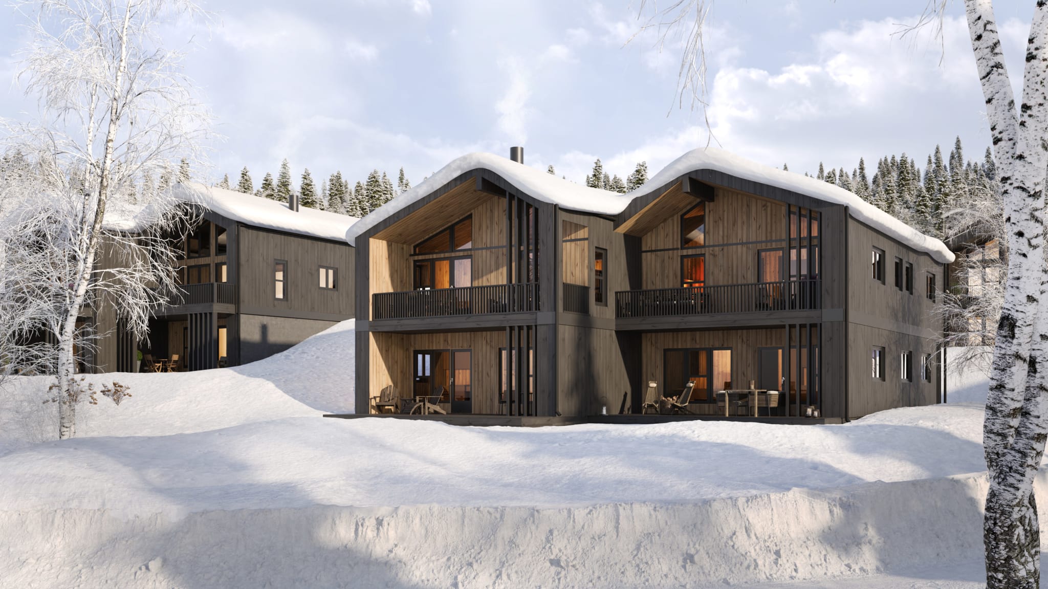 Våre moderne leiligheter er fra koselige 67 m2 til romslige 149 m2, og gir deg det beste fra to verdener: komforten du ønsker og naturen du trenger. Store vinduer lar deg våkne opp til panoramautsikt og hjelper til med å viske ut skillet mellom ute og inne.