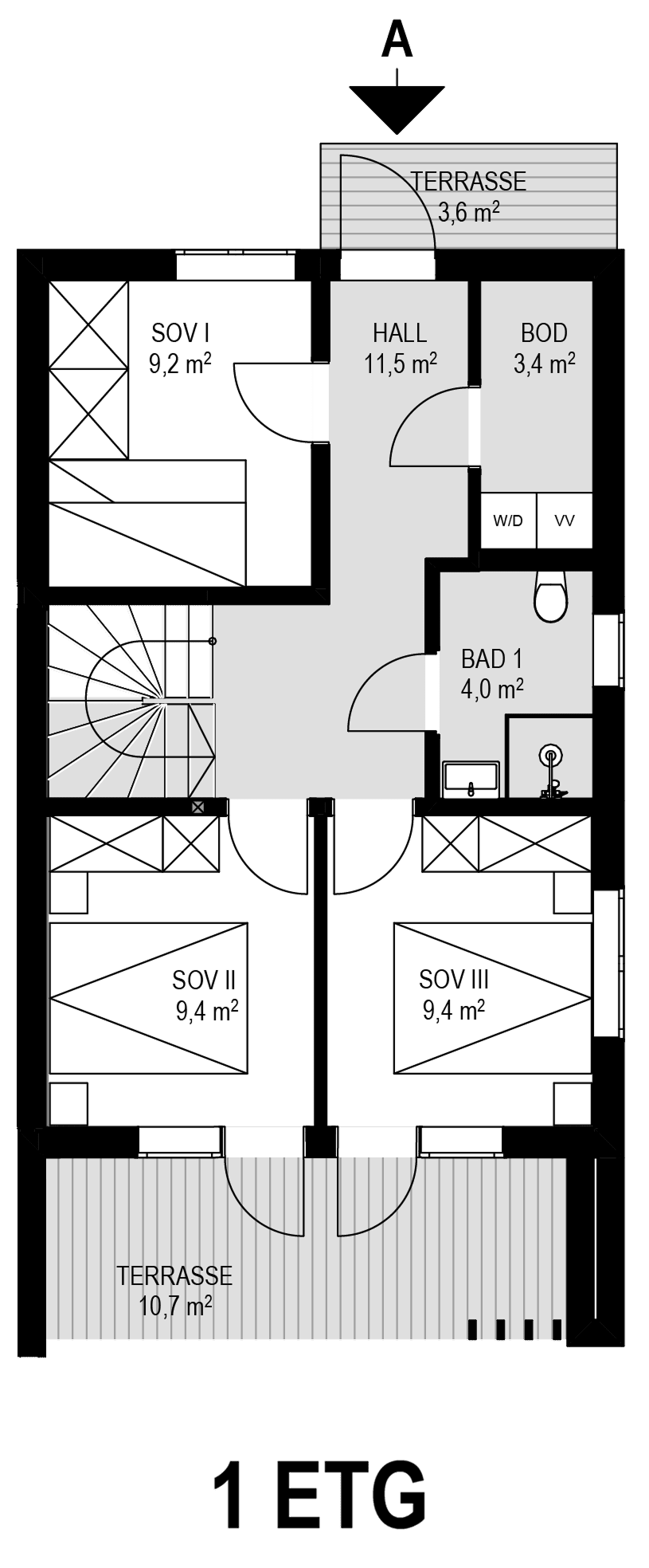 Romslig 5-roms leilighet over to plan. Hovedsoverom med eget bad.